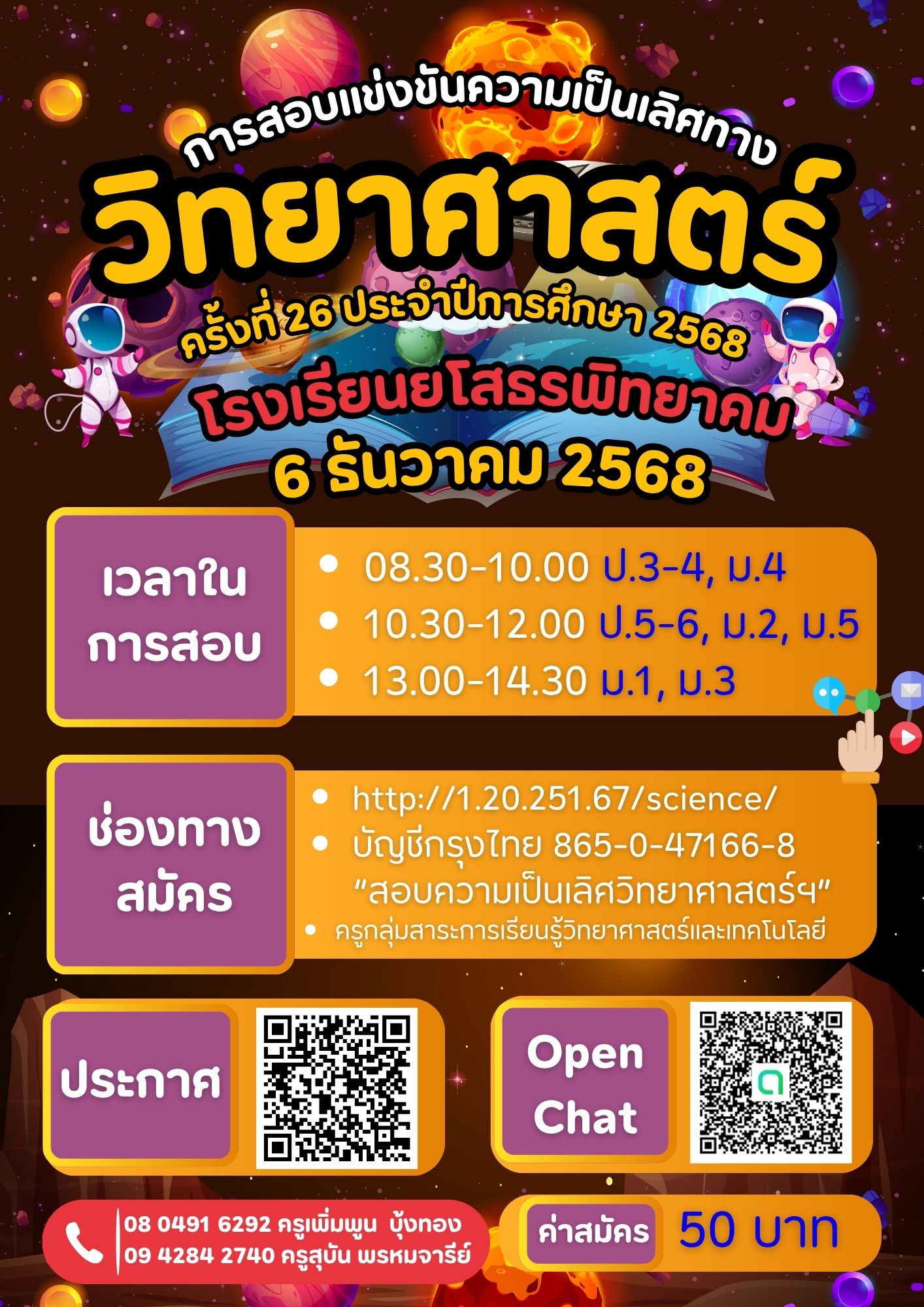 ระบบการรับสมัครนักเรียนเข้าสอบ การสอบแข่งขันความเป็นเลิศทางวิทยาศาสตร์ ครั้งที่ 26 ประจำปีการศึกษา 2568 สอบวันเสาร์ที่ 6 ธันวาคม 2568 **ปิดรับสมัคร** คำนำหน้าชื่อ: --เลือก-- เด็กชาย เด็กหญิง นาย นางสาว ชื่อตัว ชื่อสกุล กำลังเรียนในระดับชั้น --เลือก-- ประถมศึกษาปีที่ 1 ประถมศึกษาปีที่ 2 ประถมศึกษาปีที่ 3 ประถมศึกษาปีที่ 4 ประถมศึกษาปีที่ 5 ประถมศึกษาปีที่ 6 มัธยมศึกษาปีที่ 1 มัธยมศึกษาปีที่ 2 มัธยมศึกษาปีที่ 3 มัธยมศึกษาปีที่ 4 มัธยมศึกษาปีที่ 5 โรงเรียน: จังหวัด: --เลือกจังหวัด-- กระบี่ กรุงเทพมหานคร กาญจนบุรี กาฬสินธุ์ กำแพงเพชร ขอนแก่น จันทบุรี ฉะเชิงเทรา ชลบุรี ชัยนาท ชัยภูมิ ชุมพร เชียงราย เชียงใหม่ ตรัง ตราด ตาก นครนายก นครปฐม นครพนม นครราชสีมา นครศรีธรรมราช นครสวรรค์ นนทบุรี นราธิวาส น่าน บุรีรัมย์ ปทุมธานี ประจวบคีรีขันธ์ ปราจีนบุรี ปัตตานี พระนครศรีอยุธยา พะเยา พังงา พัทลุง พิจิตร พิษณุโลก เพชรบุรี เพชรบูรณ์ แพร่ ภูเก็ต มหาสารคาม มุกดาหาร แม่ฮ่องสอน ยโสธร ยะลา ร้อยเอ็ด ระนอง ระยอง ราชบุรี ลพบุรี ลำปาง ลำพูน เลย ศรีสะเกษ สกลนคร สงขลา สตูล สมุทรปราการ สมุทรสงคราม สมุทรสาคร สระแก้ว สระบุรี สิงห์บุรี สุโขทัย สุพรรณบุรี สุราษฎร์ธานี สุรินทร์ หนองคาย หนองบัวลำภู อ่างทอง อำนาจเจริญ อุดรธานี อุตรดิตถ์ อุทัยธานี อุบลราชธานี หมายเลขโทรศัพท์ (ตัวเลข 10 หลัก พิมพ์ติดต่อกัน เช่น 0879615762 ) สมัครสอบระดับชั้น ป.3-4 ป.5-6 ม. 1 ม. 2 ม. 3 ม. 4 ม. 5 หมายเหตุ ห้ามสมัครสอบต่ำกว่าระดับชั้นที่เรียนอยู่ **ดูประกาศ** โรงเรียนสามารถดาวน์โหลด *หนังสือราชการ* สมัครมากกว่า 1 ระดับได้ แต่เวลาสอบต้องไม่ตรงกัน **ดูตารางสอบ** ผู้สมัครต้องใช้บัตรประจำตัวประชาชน หรือบัตรประจำตัวนักเรียนในการแสดงตนเข้าสอบ หากผู้สมัครสอบใช้ข้อมูลที่เป็นเท็จ ถือว่าการสมัครสอบเป็นโมฆะ สอบถามข้อมูลเพิ่มเติม ครูสุบัน พรหมจารีย์ เบอร์ติดต่อ 09 4284 2740 คุณครูเพิ่มพูน บุ้งทอง เบอร์ติดต่อ 08 0491 6292 การชำระเงิน โอนเงิน เข้าบัญชีธนาคารกรุงไทย ชื่อบัญชี “สอบความเป็นเลิศวิทยาศาสตร์ฯ” หมายเลข 865-0-47166-8 ** ค่าสมัครต่อคน ต่อระดับ 50 บาท ** วันที่ชำระ เวลาชำระ : Time: จำนวนเงินที่ชำระ บาท แนบใบชำระเงิน (.pdf .png jpg):